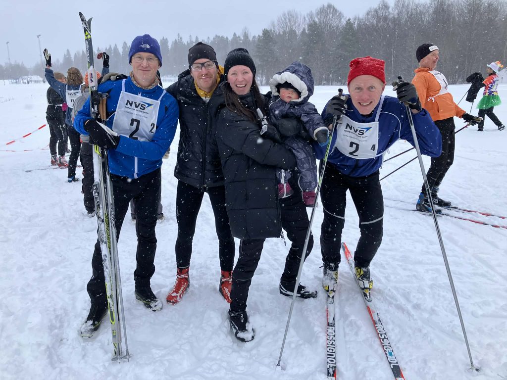 Några tappra CERE medlemmar bytte skrivbord mot skidor den 26 februari och deltog i den årliga KBC stafetten runt universitetscampus. Laganda, frisk luft och ett ymnigt snöfall gjorde det till ett perfekt avbrott i forskningen. De trötta men glada skidåkarna är (från vänster) Göran Bostedt, Mattias Vesterberg, Hanna Lindström och Sef Meens Eriksson. Sven Lindström hejade på från sidan.