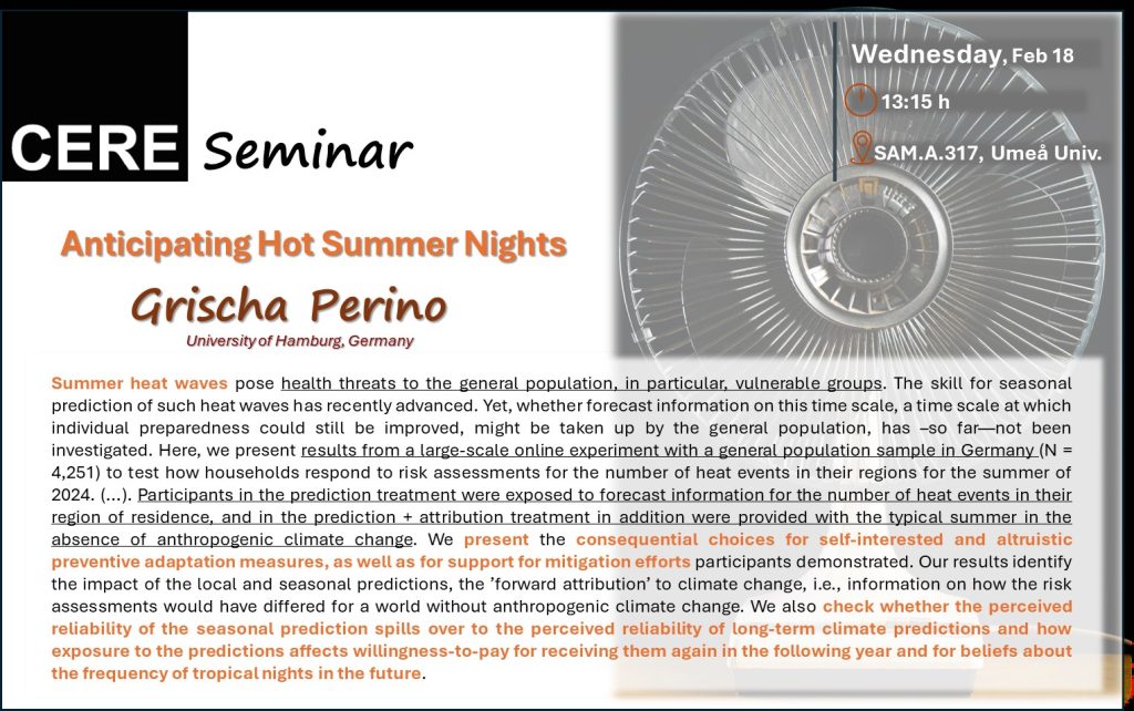 Cere / Events / Event-en / CERE Seminar: Grischa Perino, Hamburg University CERE Seminar: Grischa Perino, Hamburg University Wednesday 18 Feb, 2026 13:15 - 14:15 SAM.A.317, UmU Skip back to main navigation